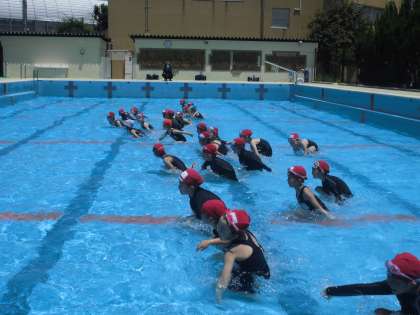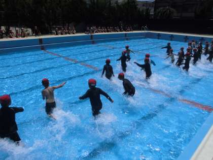 今週から水泳学習が始まりました。最初は低水位での学習でしたが、季節外れの暑さにみんな大喜びでプールに入りました。水遊びを通して少しずつ水に慣れていってほしいです。