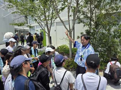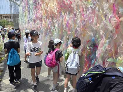 最後に学習の振り返りをしました。係の方から「20年後30年後どんな未来になればよいか好きな色を選んで結んで下さい」と説明を聞いた後NTTの壁に自分が選んだテープをつけました。未来を十分感じることができました。