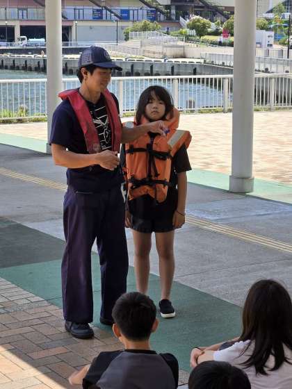 リゾートクルーズに到着しました。係員の方から救命胴衣の説明や約束事について話を聞きます。