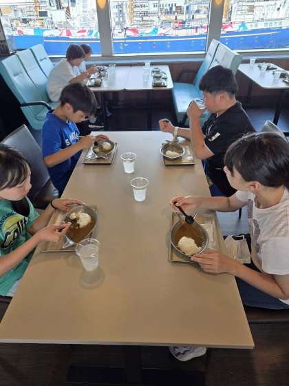 乗船後は昼食です。「カレーのにおいがする。」とお腹が減ってきました。