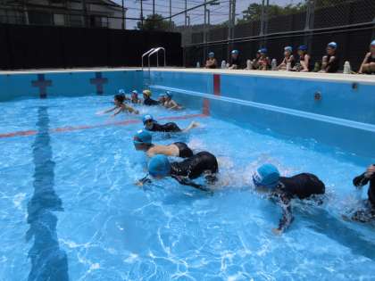 今日も気温がぐんぐん上がり暑い1日となりました。3・4時間目の水遊びではカニ・カエル・ワニなどの水中の生き物に変身して水に慣れていきました。