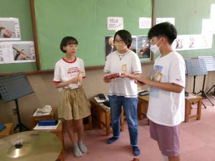 ラバーズコンチェルトの曲に合わせてリズム伴奏を行いました。チームで話し合って、楽器の組み合わせやリズムパートを決めました。