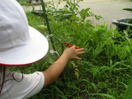 わかば学級の畑で育てているミニトマトが赤く色付いたので収穫しました。大きなトマトも赤くなってきました。他にもなすも大きくなってきました。早く収穫するのが楽しみです。