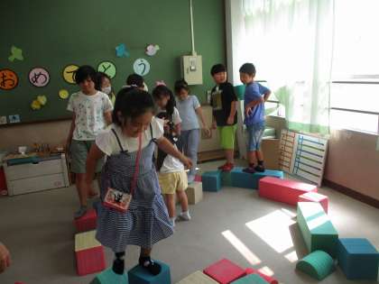 休み時間にわかば2組の教室でみんなで仲良く遊んでいます。大きな積み木を石に見立てて、みんなでジャンプして渡りました。高学年や中学年が低学年のお友達に声を掛けながら楽しく遊ぶことができました。