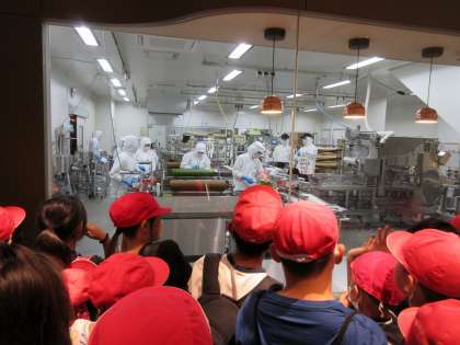次に、京バウムの工場も見学に行きました。おたべは和菓子でしたが、京バウムは洋菓子のバウムクーヘンの工場です。子どもたちは見学したことで「バウムクーヘンに穴が開いているのは、作るときに棒に巻き付けて作るからやったんやね!」と、バウムクーヘンの穴の秘密を発見していました。
