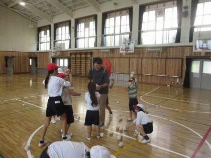 育成学級の合同運動会に向けて、玉入れの練習をしました。先生がカゴを背負って動き回るので、そのカゴを目掛けて玉を投げます。みんなで協力してたくさん玉を入れることができました。