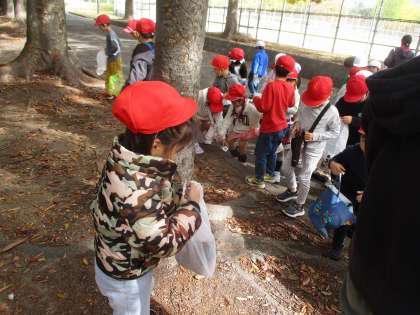 1年生が勧修寺公園に秋見つけに行きました。公園ではたくさんのどんぐりや落ち葉を見つけることができました。友達と声を掛け合いながら、袋いっぱいにどんぐりや落ち葉を集めていました。