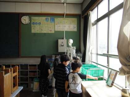 1年生は、理科室にあるがい骨にどきどきしながら近づいたり、職員室や校長室などを案内してもらったりしていました。