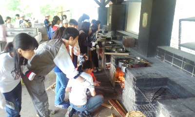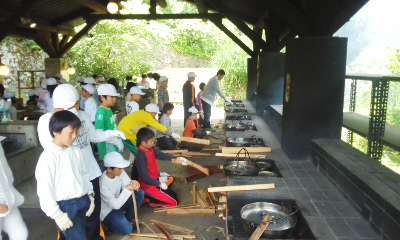 目に涙をためながらもかまど係さんが頑張っています。あと少し!