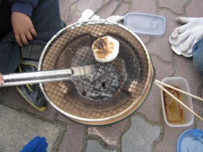 体験学習として七輪で火をおこしておもちを焼き,