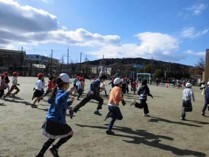 今日から24日(火)までの11日間、25日のマラソン大会にむけて「中間マラソン」が、はじまりました。笛の合図で一斉にスタートし、5分間はしります。運動委員会の人がコーンを立てるなど準備をしてくれています。