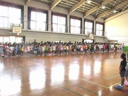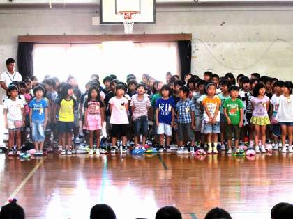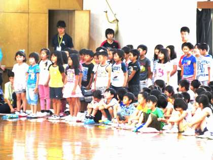 後半は,全学年全員でマザーグースの「せかいじゅうのうみが」を音読しました。今まで,各学年パートを決めて練習していました。合わせるのは当日初めてでしたが,バッチリきまって今した。