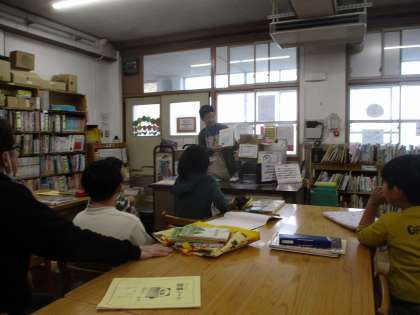 図書室で学校司書の先生に絵本を読み聞かせしてもらいました。今日は「やまのおふろやさん」と「もりのおふろやさん」の2冊を読んでもらいました。山や森の中で色々な動物たちがお風呂に入るお話でした。子どもたちも楽しそうにお話を聞いていました。