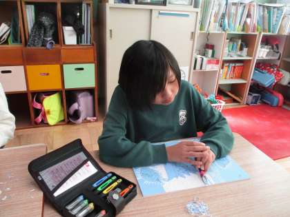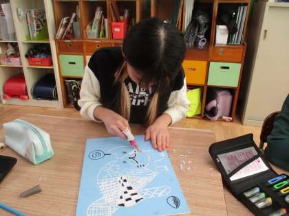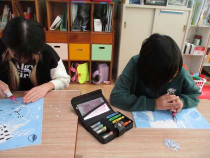 5年生の2人が、彫刻刀を使って「シュッ…シュッ…」と気持ちよさそうな音を立てて板をどんどん彫り進んでいきます。けがをしないように気をつけながら、黙々と彫り進める2人です。どんな作品が仕上がるか楽しみです。