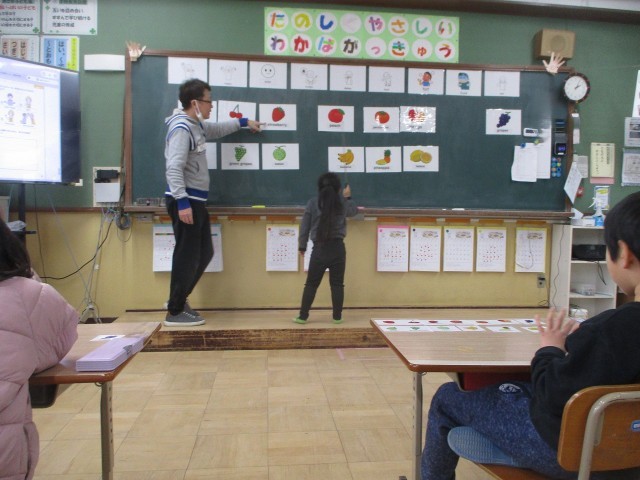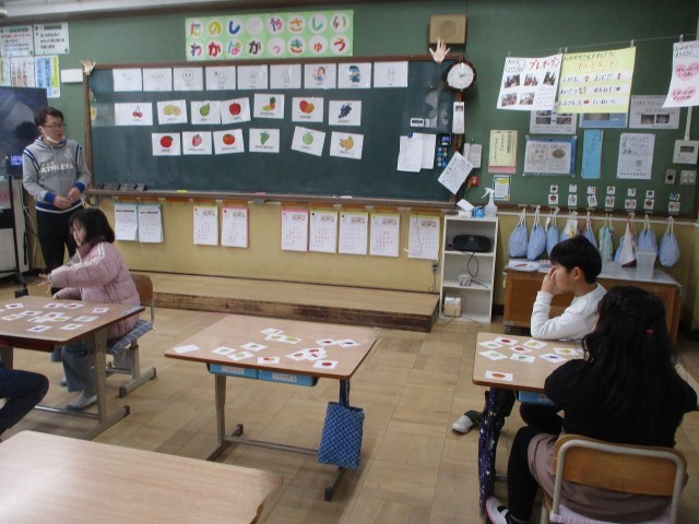 ミッシングゲームをしたり、カルタ取りゲームをしたりして、果物の英語での言い方を