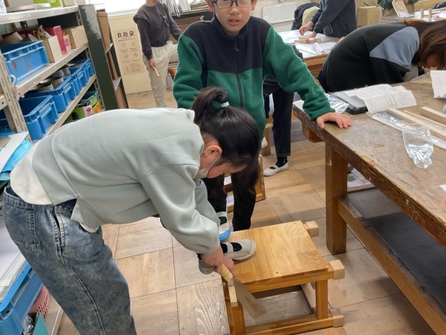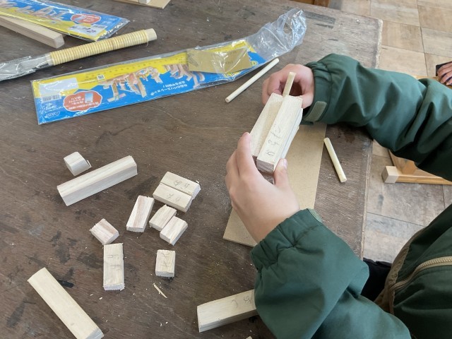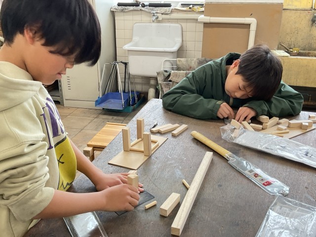 木材をのこぎりで切ったり、やすりで削ったりして形を整えています。