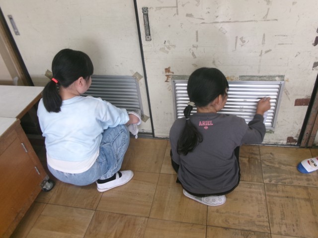 普段の掃除では気付きにくい場所の汚れもきれいにしようと、ほうきで掃いたり、雑巾で拭いたり一生懸命大掃除に取り組むみんな。「見て~こんなに汚れが取れたよ。」と真っ黒になった雑巾を見せていました。