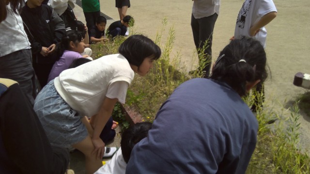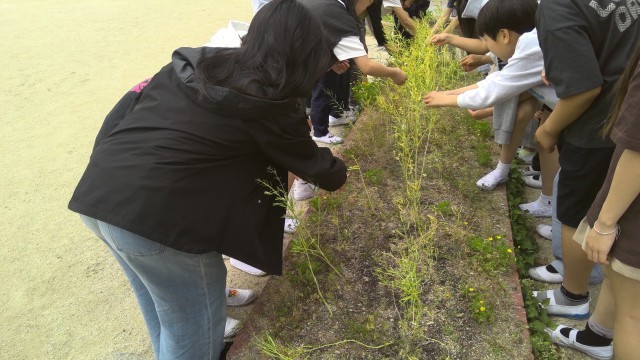 校庭の花壇のアブラナの観察をしました。アブラナの花のつくりについて学習しました。