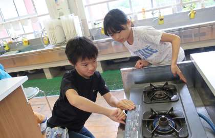 今日は,5年生になって初めての家庭科室での学習でした。『探検しよう』と題して,計量カップや包丁,まな板など,家庭科室のどこにどんな用具があるのか探しました。その後は,ガスこんろの正しい使い方について学習しました。ガスこんろを初めて扱う子どもたちも多いなか,燃えやすいものはないか,換気は十分か,そして火傷しないように気を付けているかなど,協力し合って活動する姿が見られました。「はやく調理実習がしたいな!」と張り切る声がたくさんありました。