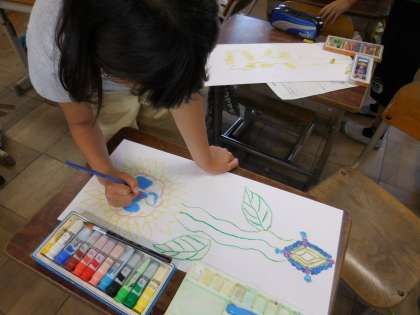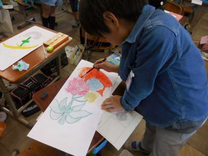 図画工作科で「まぼろしの花」という題材に取り組んでいます。だれも見たことも聞いたこともないまぼろしの花を想像してお話を作り,画用紙に描いています。色々な工夫がみられ,仕上がっていくのが楽しみです。
