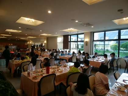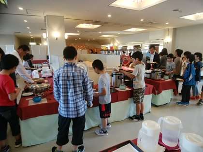 朝の健康観察の後、朝食をいただきます。朝はバイキング形式の食事です。ちょっと寝不足の子もいるようですが、楽しくたくさん食べています。