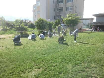今日から,PTA・各種団体のみなさんによる芝生の手入れが始まりました。今日は,PTAの環境美化委員会の方にお世話になり,雑草を抜いていただきました。また,おやじの会の方も芝刈りに来てくださりました。