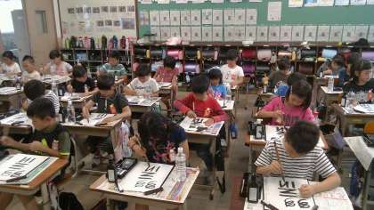 絵の具とは違う墨や毛筆などの感触を確かめ,心を落ち着かせながら熱心に書いていました。