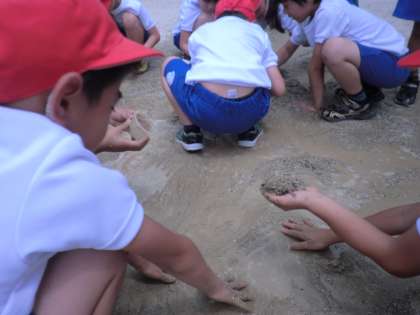 生活科の学習で,砂場で水遊びを行いました。泥団子を作ったり,お山を作ったり,運動場に水で絵をかいたりしました。とても暑かったですが,子どもたちは全力で取り組み,楽しんでいました。