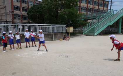 水泳学習と並行して,ベースボールの学習に取り組んでいます。バットとボールを手にすると,喜んでフルスイングやキャッチボールを始める子どもたち。実際のルールに近いゲームを進めていくと,思い通りにバッティングしたり,ボールを投げることができないことに首をかしげる姿が多かったです。そんな中,一度バットにボールが当たると,チームのみんなが大歓声!