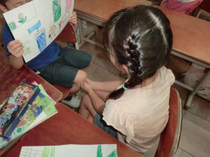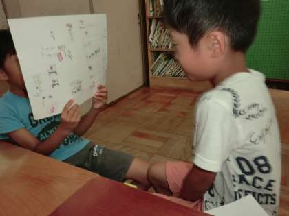 国語科「すきなこと,なあに」の学習で,自分の好きなこととその理由を文に書き,友だちに伝えあいました。子どもたちは相手に伝わりやすいように絵も見せて説明しました。聞く側は,質問をしたり,感想を言ったりして,楽しそうに聞いていました。