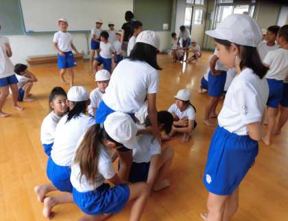 手の位置や立つタイミング,気持ちの合わせ方などを相談して,実際に組むことができました。今後も,体育館や運動場を使って練習をしていきたいと思います。