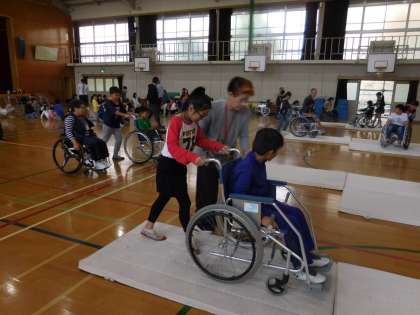 後半には,実際に車いすに乗ったり,サポートしたりする体験をさせていただきました。