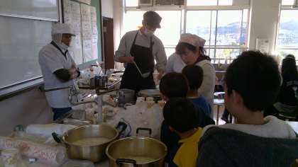 食育の先生やお豆腐屋さんに豆腐の作り方を教えていただきました。豆乳ににがりを混ぜて固まった豆腐を見て驚きを隠せないようでした!にがりを味見した時のみんなの「しょっぱい!」という表情が忘れられません!自分で作った出来立ての豆腐はみんなとてもおいしそうに食べていました。