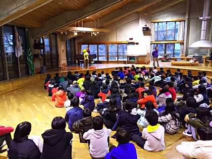 朝の集いです。一緒に宿泊している祥豊小学校のみなさんも一緒です。