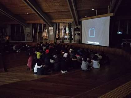 夕食の後は天体DVDを鑑賞しました。秋や冬の天体や星座について学習したあと、外に出て空を見てみました。「うわあ きれい」と大歓声。カシオペア座やプレアデス星団などが美しく輝く夜空。感動的な時間でした。