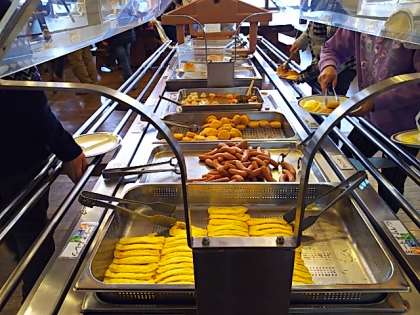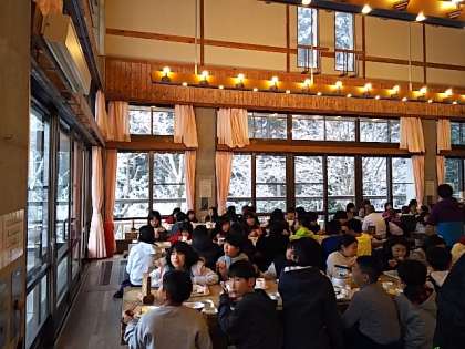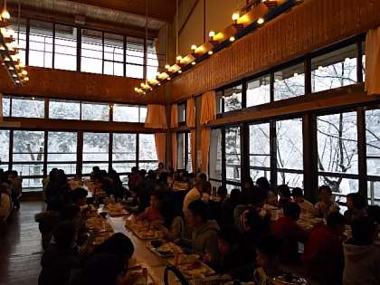 朝食は食堂でバイキングです。ご飯かパン、みそ汁かスープを選ぶことができます。外は雪景色。みんなの気持ちも高まります。