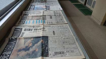 校長室の前に,阪神淡路大震災,東日本大震災が発生した当時の新聞が掲示してあります。