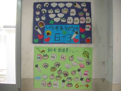 2月4日から給食週間が始まりました。1月の朝会では給食委員からの給食についてのクイズやランキングの発表,給食調理員さんの一日の紹介がありました。それを聞いて,各クラスで寄せ書きを作りました。