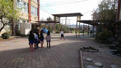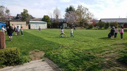 百々小自慢の芝生広場で走り回ったり,咲き始めたチューリップを観察したり,中庭でなわとびをしたり…。