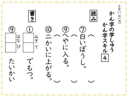 さて,おうちで学しゅうはすすめられていますか?きょうはかん字のもんだいをよういしました。きょうのしゅくだいでもでていますね。