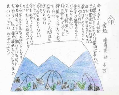 これは,道徳の教科書に載っている詩です。宮越(みやこし)さんという当時小学4年生の女の子が,がんの治療(ちりょう)をうけながら病院の中で力をふりしぼって書いたものです。