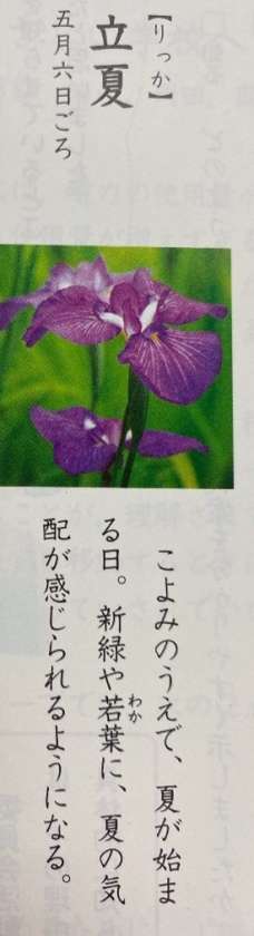 毎年5月6日ごろには立夏(りっか)を迎え,こよみの上で夏が始まる日とされています。国語の教科書には,季節の言葉がたくさん載っているのでぜひ読んで言葉を増やしておきましょう!これを使って俳句や短歌が考えられたあなたは・・・素晴らしい!