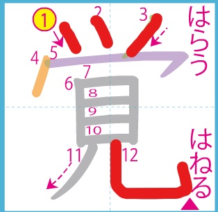 ○「覚」…1〜3画目の点の形に気をつけましょう。12画目はしっかりはねてくださいね。