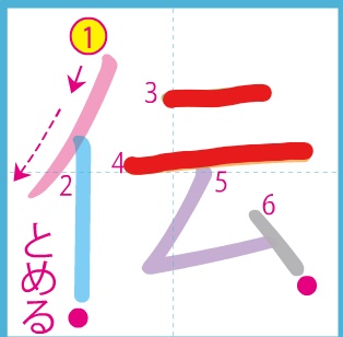 ○「伝」…「へん」は「にんべん」です。3画目よりも4画目のほうが長くなっています。
