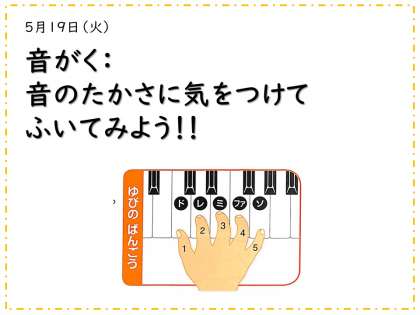 けんばんハーモニカのれんしゅうははかどっていますか?ただえんそうしたり,うたったりするだけでなく,「きょうはここに気をつけてうたおう,えんそうしよう」というように,めあてをきめてれんしゅうできるとよいですね。