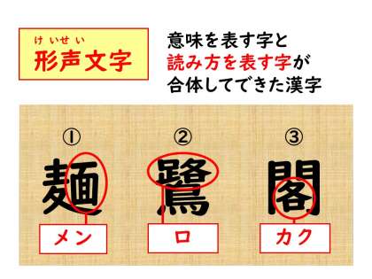 次の漢字を見てみましょう。「鷺」には「路」という部分がありますね。なので,「ロ」と読みます。最後の漢字「閣」には「各」という部分があるので「カク」。すごいですね。恐(おそ)るべし形声文字!!