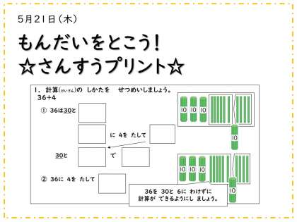 きょうのさんすうのしゅくだいは,プリントの「たし算とひき算(1)」ですね。きょうかしょやプリントに書いてあることをよく読んで,学しゅうをすすめていきましょう!