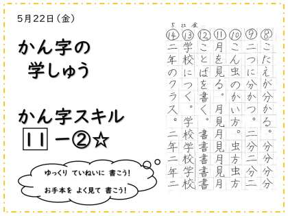 きょうの2年生のかん字のかだいは11の2です(8〜14)。