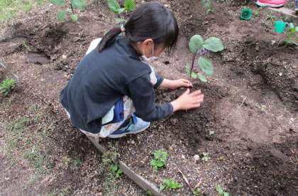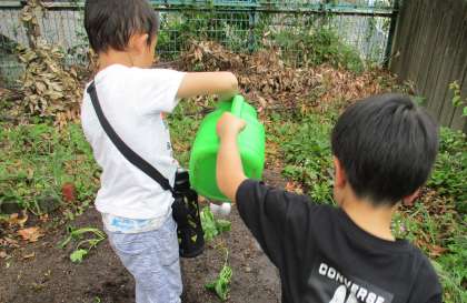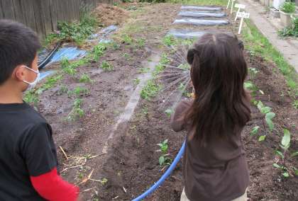 とくれいあずかりの子たちが,やさいのなえをうえるのを手つだってくれました。いろんなしゅるいのなえを,ていねいにうえてくれました。水やりも,なかよくこうたいごうたいにできていました。