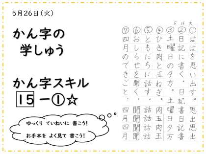 きょうのしゅくだいには,かん字スキルがでていますね。かん字れんしゅうちょうに書くのは,もうなれてきましたか?